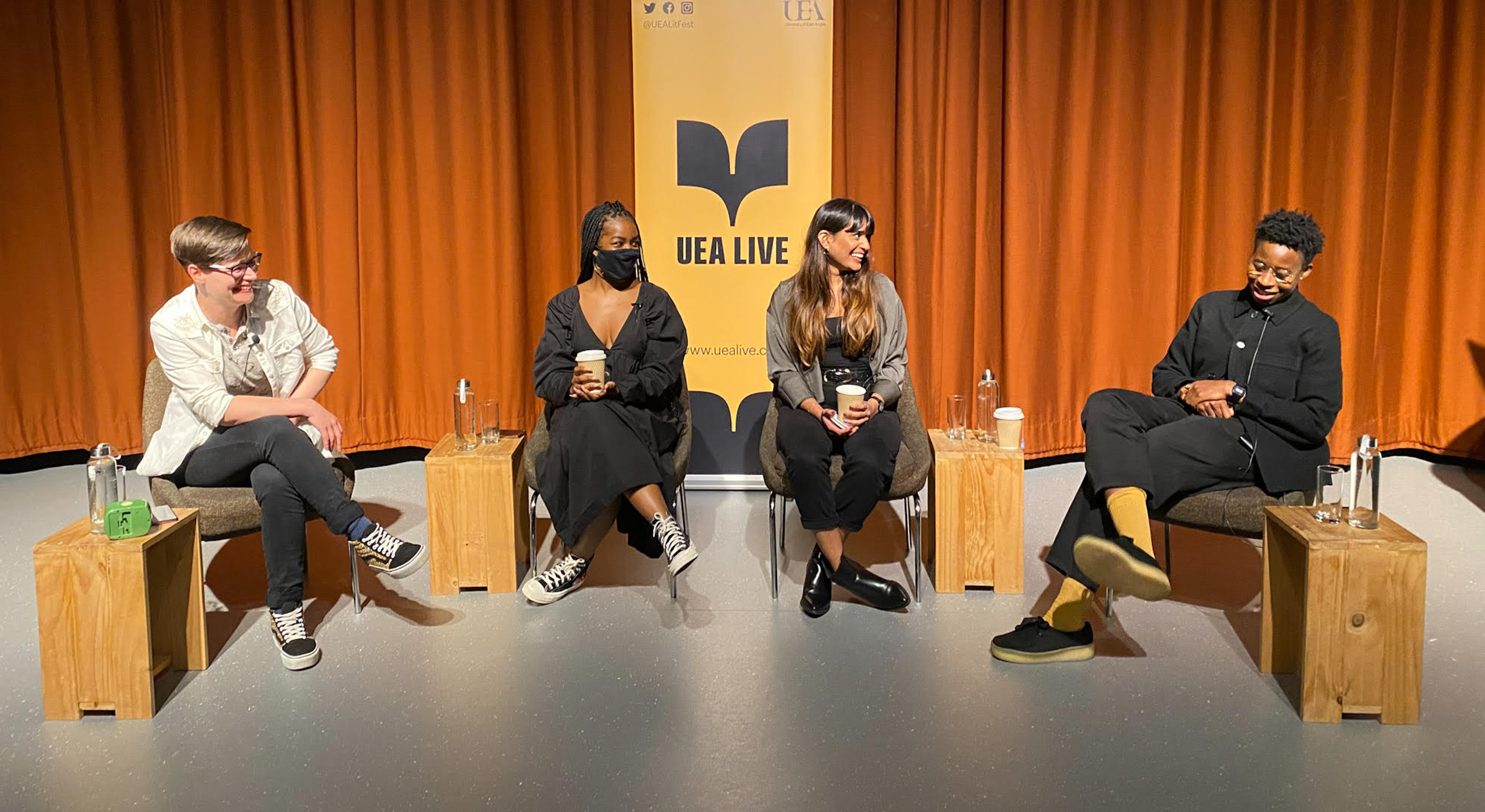 Following on from last week’s Bimini Bon Boulash event, on 20 October UEA Live welcomed three distinct voices from #Merky Books. Since 2018, #Merky Books has been an established Penguin Random House imprint curated by British musician Stormzy, dedicated to publishing all forms of writing from a new generation of voices; #Merky uplifts under-represented voices and narratives. Representing #Merky Books at UEA Live were Jade LB, author of the 2000s viral hit Keisha the Sket; Jyoti Patel, winner of the 2021 #Merky Books New Writers’ Prize; and #Merky’s Senior Commissioning Editor, Lemara Lindsay-Prince. Joining them on stage as chair was UEA Live Co-Director and UEA Creative Writing Lecturer KR Moorhead.