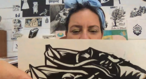 As a university student, I have often worried about how to conflate art with a paid career. However, I experienced a surge of confidence after experiencing Sophie Herxheimer’s vibrant, enthusiastic energy. Surrounded by a collage of black and white lino prints, the illustrator’s passion for her work was almost tangible. In response to an audience question about a typical day in the studio, Herxheimer emphasised her creative experimentation. Given the freedom to create, she “harnessed the unconscious” by experimenting with words and images until she arrived at the finished project. I was fascinated by her process of being led by unrestrained creativity, and approaching projects as adventures to be explored. Herxheimer compared her artistic task to an orchestra conductor. I particularly enjoyed this metaphor, as the “schemas” Herxheimer created enabled her to map out ideas on pieces of paper, providing a visual beginning, middle, and end. This method allowed the reader to progress through the book via a mix of words and images. Herxheimer commented that she aimed to “match the landscape of [Marina’s] writing.” This is reflected in the bold yet elegant line prints that accompany the novel.